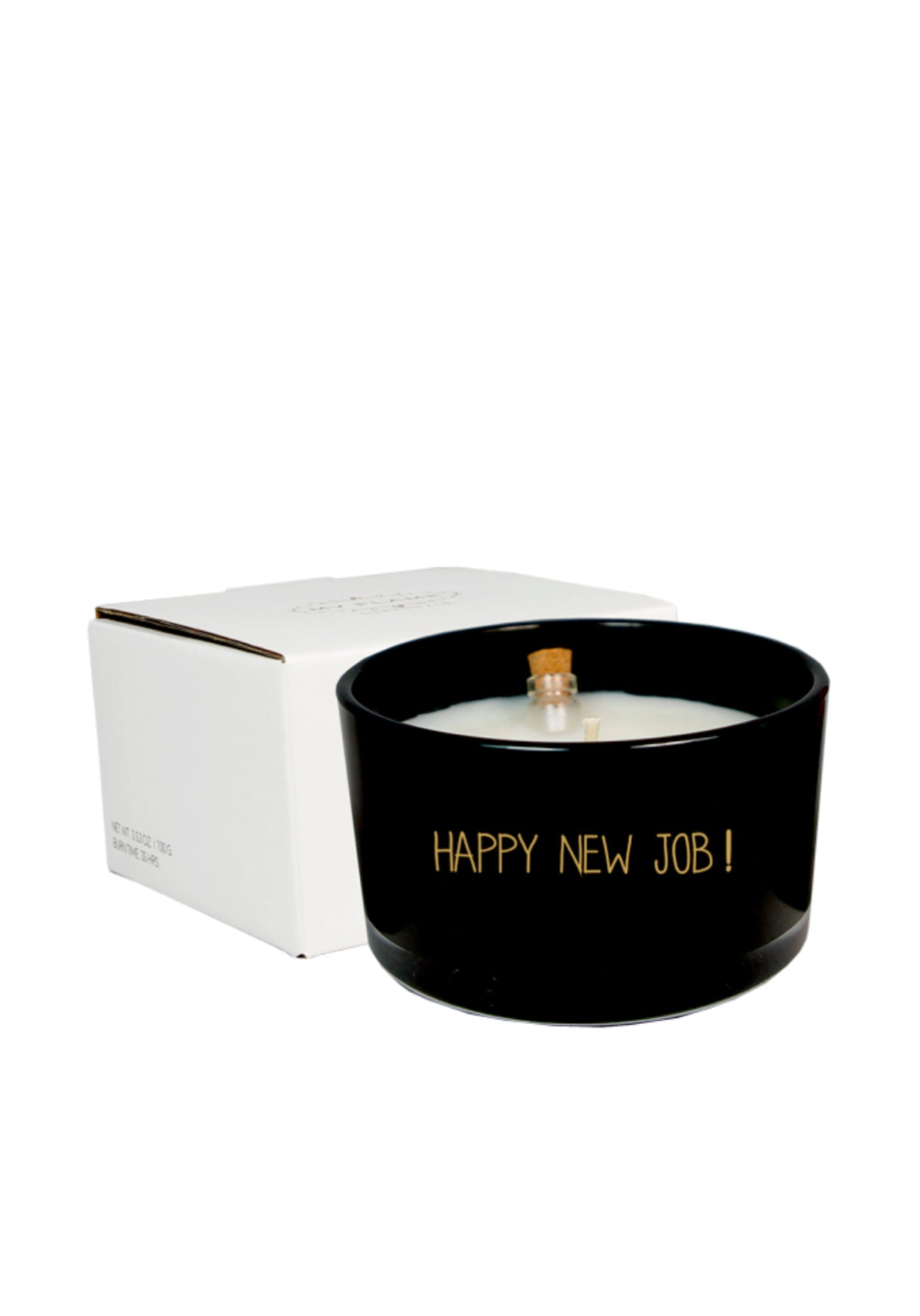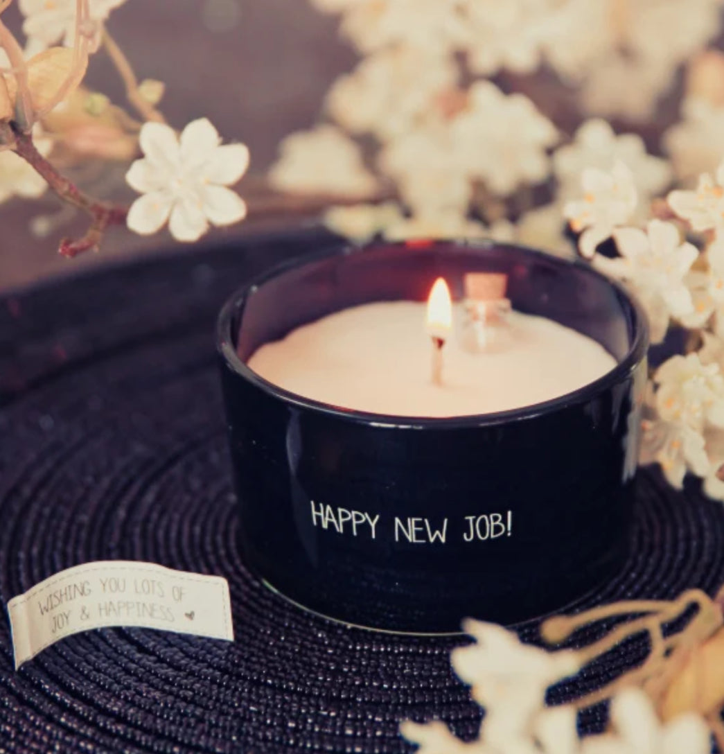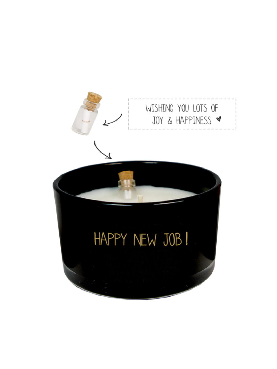 Op de geurkaars staat 'Happy new Job!'. In de wax vind je een flesje met daarin een briefje. Voordat je de kaars brandt kan je het flesje uit de wax trekken en de kurk van het flesje halen en het briefje eruit halen. Op het briefje staat 'Wishing you lots of joy and happiness'. Een origineel afscheidscadeau voor een collega of voor een vriend(in) die een nieuwe baan heeft.